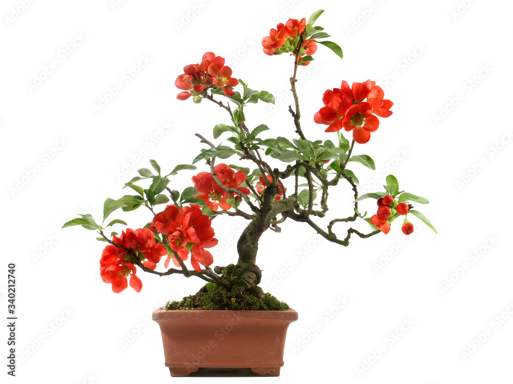 Quince Bonsai with red Blossoms in a Brick Pot isolated on white Background