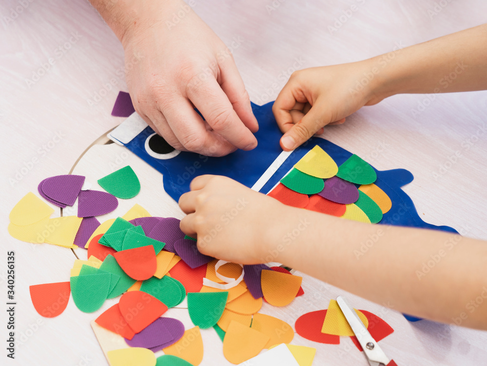 Father and son stay at home making colourful Koinobori (Carp streamers),Man hand and kid hand healping eachother doing Japanese fish kite on weekend,Social distancing