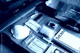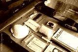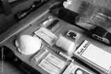 Emergency evacuation survival grab bag gear or items displayed on a wooden table.