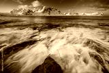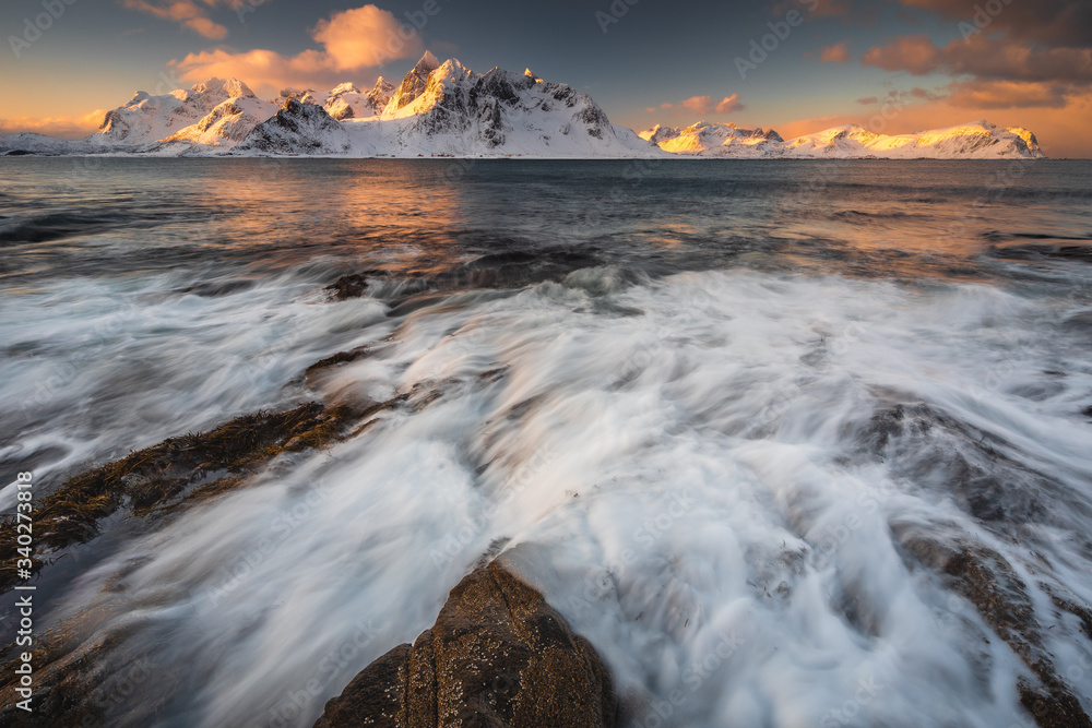 Soft tones of the golden hour in mountains at the coast of Vareid, Lofoten, Norway