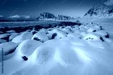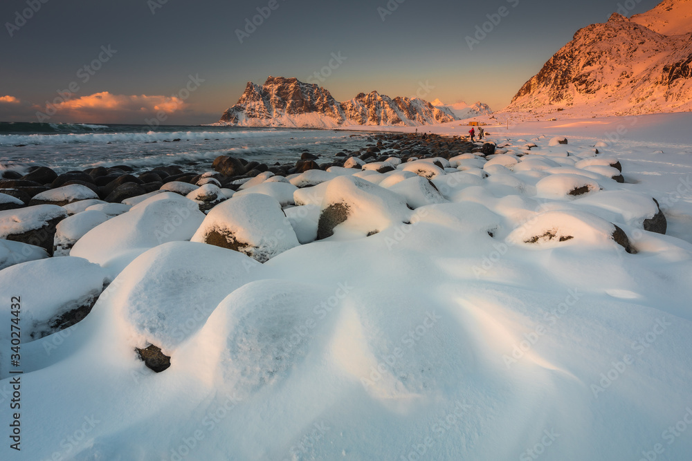 Sunset over the Uttakliev beach in Lofoten islands, winter time