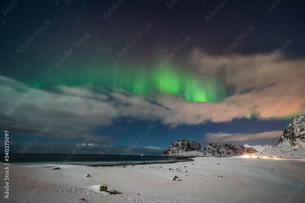 Amazing Aurora Borealis dancing over famous Uttakleiv Beach during a cold arctic night on Lofoten Islands archipelago in winter, Norway, Scandinavia
