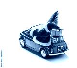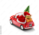 Santa Claus driving red car with gift boxes and Christmas tree isolated on white, view from outside