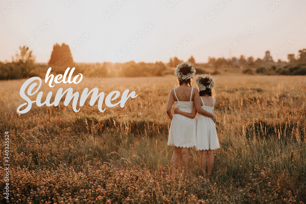 Greeting card with the inscription Hello Summer. Mother and daughter in the field