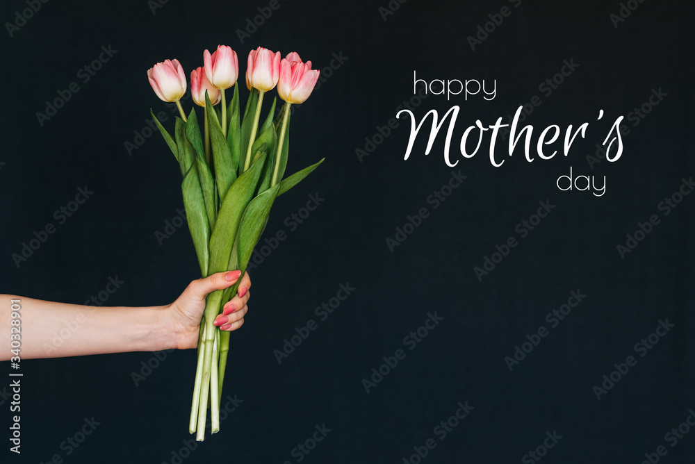 Greeting card with the inscription Happy Mother's Day. Bouquet of Pink tulips