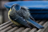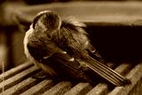 Meise sitzt schlafend mit dem Kopf unter dem Flügel auf einem Geländer
