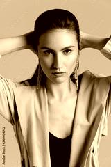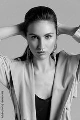 Beautiful sexy brunette woman in a black bodysuit, a beige trench coat with large gold earrings posing on a gray background in the studio. Close-up portrait of a model with professional liner make-up