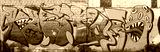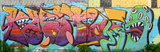 Abstract colorful fragment of graffiti paintings on old brick wall with scary octopus face. Street art composition with parts of unwritten letters and cartoon character