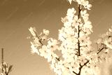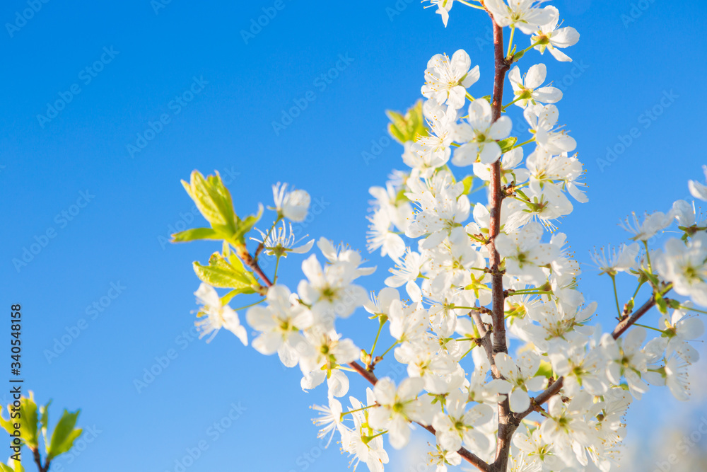 White flowers of cherry blossoms on sunny spring day. Blooming sakura tree on sky background in garden or park. Cherry blossom.