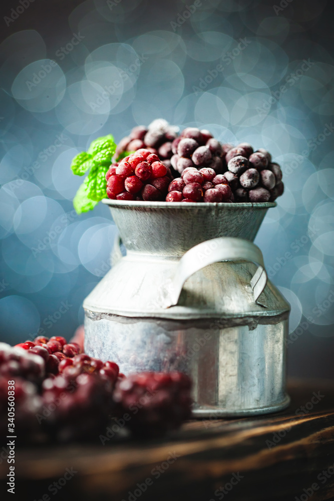 Frozen blackberries on a wooden table. Vertical.