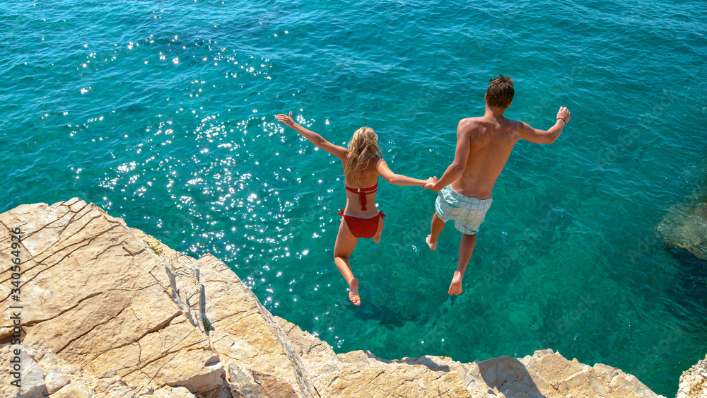 Carefree young tourists holds hands while jumping into the refreshing blue sea.