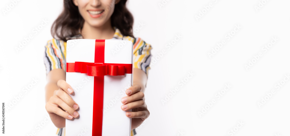 Giving gift box, receive gift box in birthday, new year, valentine, Christmas, special day with happiness, smiley face. Beauty woman get happy when get gift, smile face. isolated on white, copy space