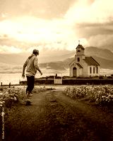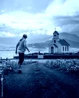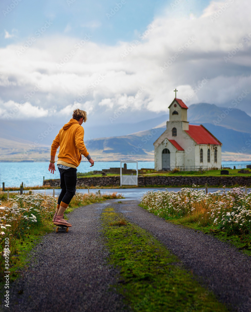 Young skater skateboarding towards a church and a cemetery in Iceland