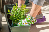 Hobbies during corona quarantine: Hands wearing daisy gloves are planting a mint root into a flower pot at city balcony