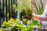 Stay at home concept: Hands wearing daisy gloves holding a root of fresh oregano for own kitchen use, growing at city balcony