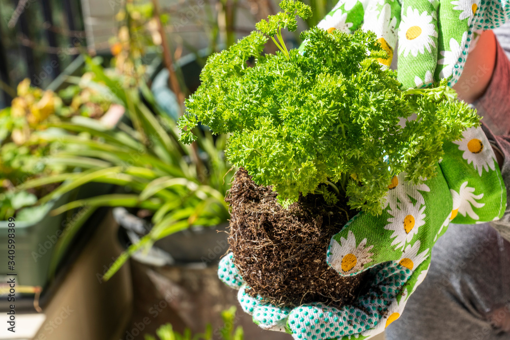 Stay at home concept: Hands wearing daisy gloves holding a root of curley parsley for own kitchen use growing at city balcony