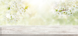 Spring background with white blossoms and white wooden table. Spring apple garden on the background