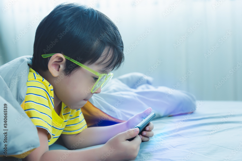 Adorable kid watching cartoon or playing game on smartphone. Young boy playing at bedroom. Lovely little boy wear eyeglasses when he was child because he always watching movie on mobile phone overtime