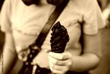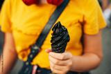 Young teen girl holding black ice cream, street food festival
