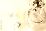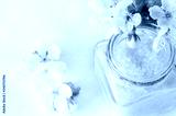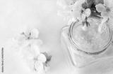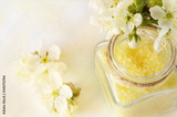 Yellow bath salt in glass bottle with spring cherry flowers on white background with copy space