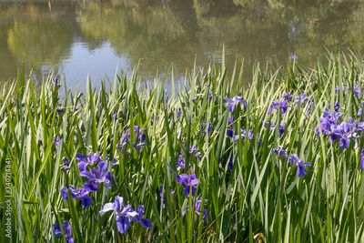 Mass planting of blue purple Siberian iris beside a lake, scenic reflection in water, horizontal aspect