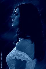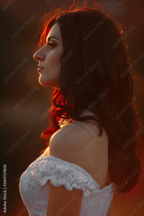 Close up romantic portrait of a beautiful bride at sunset in a field with a bouquet of wildflowers in her hands