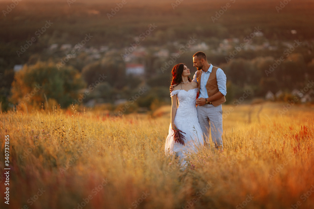 Young beautiful stylish couple in a flowering field of wheat on a road on a hill with a view of the city at sunset. Rustic wedding photo shoot. Bride and groom in a white dress with a train