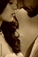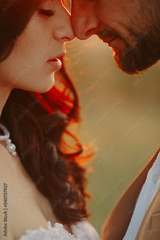 A happy, stylish couple in love on their wedding day. A close up romantic, colorful, bright portrait of the bride and groom at sunset.