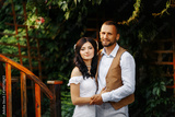 A happy, stylish couple in love posing on the bridge under a blossoming bush on their wedding day. A romantic colourful bright portrait of the bride and groom in a long white dress with a trail.