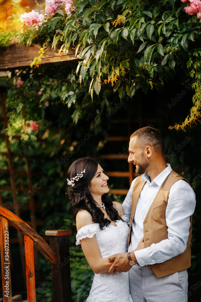A happy, stylish couple in love posing on the bridge under a blossoming bush on their wedding day. A romantic colourful bright portrait of the bride and groom in a long white dress with a trail.