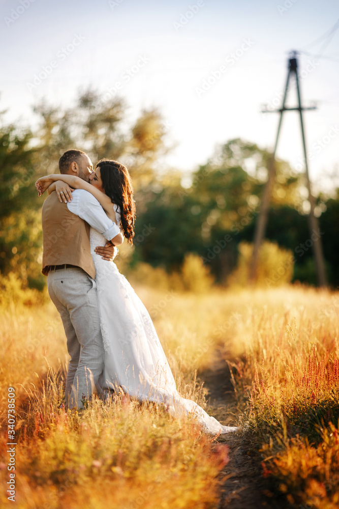 Young beautiful couple in love in a flowering field on a hill kiss at sunset. Stylish wedding photo session in rustic style. Romantic portrait of the bride and groom on their wedding day