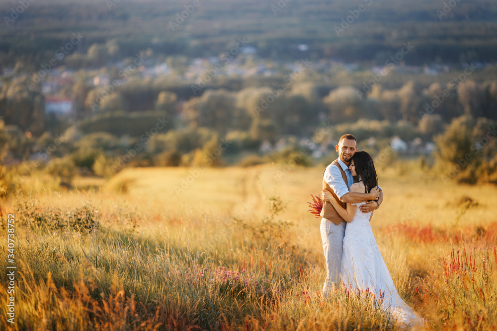 Young beautiful couple in a flowering field on a hill hug each other at sunset. Rustic wedding photoshooting. Romantic sensual portrait of the bride and groom on their wedding day