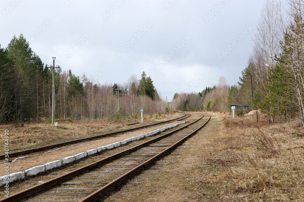 Spring view of old abandoned railway station and the rusty rails in the forest, Russia