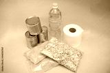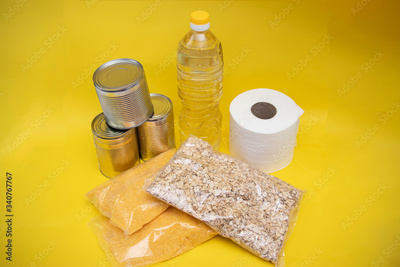 Donations food with canned food on yellow background / canned goods and dry food non perishable with cooking oil, donate concept