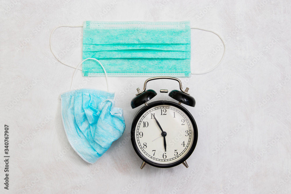 Alarm clock and medical mask. Covid 19 or coronavirus concept. Quarantine time.