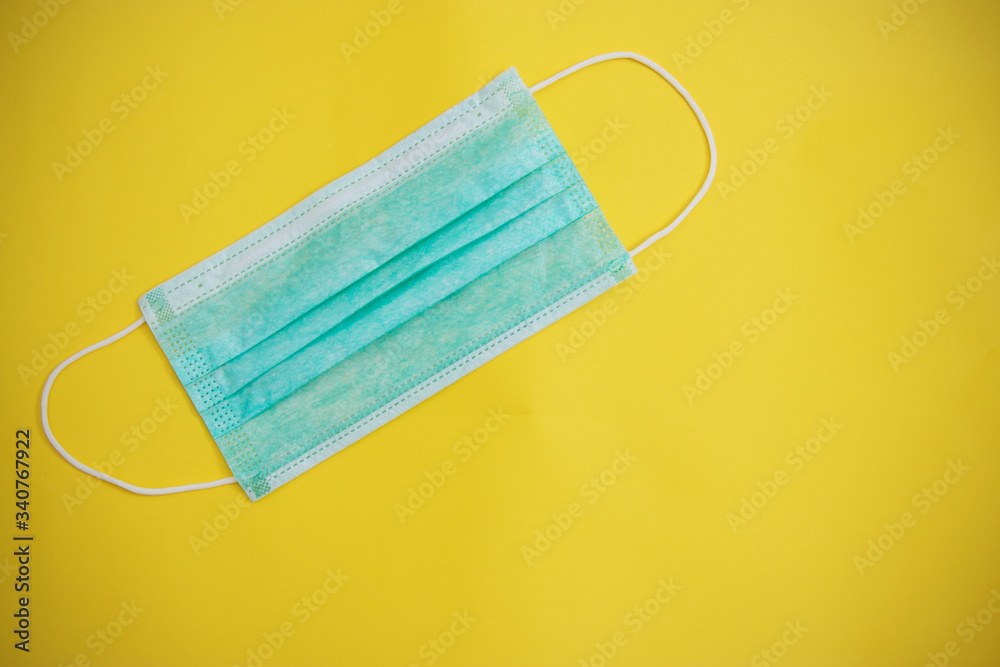 Green medical mask. Face mask protection against pollution, virus, flu and coronavirus. Yellow background. Health care concept.