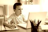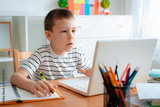 Distance learning online education. A schoolboy boy studies at home and does school homework. A home distance learning