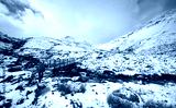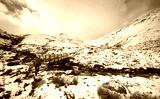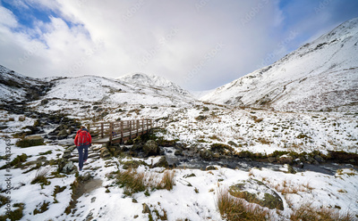 A hiker crossing Glenridding Beck over a wooden bridge on route to a snow covered Catstye Cam and Helvellyn in the English Lake District.