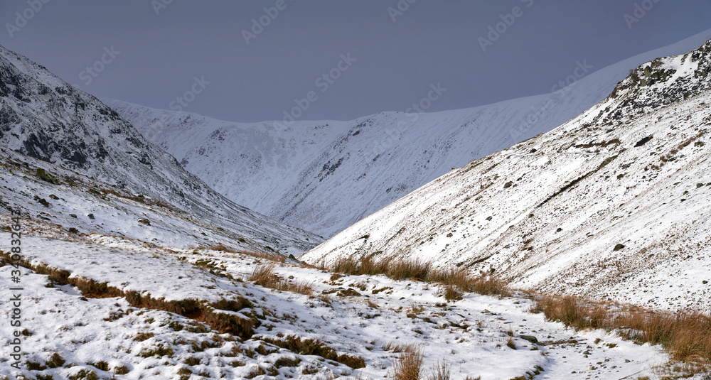 Snow and ice covered mountain ridges illuminated by the sun in the Lake District on a cold winters day. In the distance is Lower Man, Kepple Cove and Catstye Cam on the left.