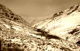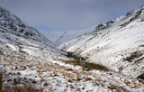 Snow and ice covered mountain ridges illuminated by the sun in the Lake District on a cold winters day. In the distance is Lower Man, Kepple Cove and Catstye Cam on the left.