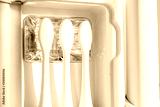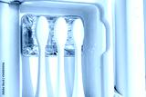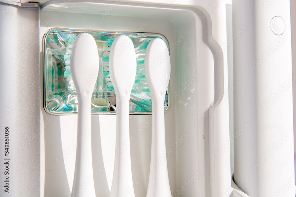 A line of the replaceable attachments of toothbrush stored in a UV disinfection stand. The family kit for tooth cleaning with vibration and sonic.
