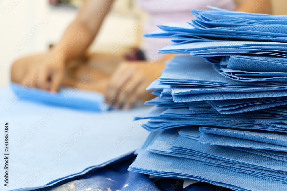 A making face masks from sterilization wrapping paper, at home. A homemade produce of masks to protect against dirt, smog and virus.
