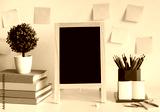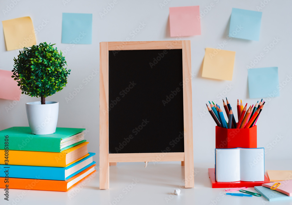 Student creative desktop layout with colorful stationery, colored pencils and bright books on a white wall background.