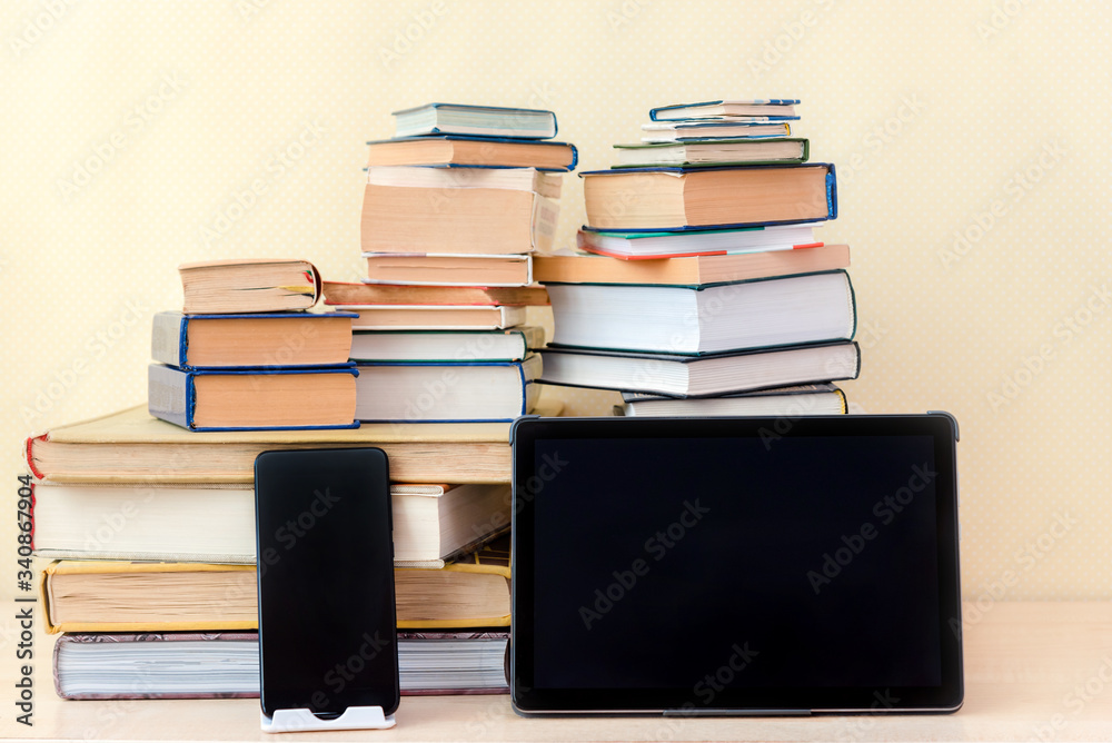 Stacks of old paper books back in the foreground modern digital gadgets: tablet, phone.