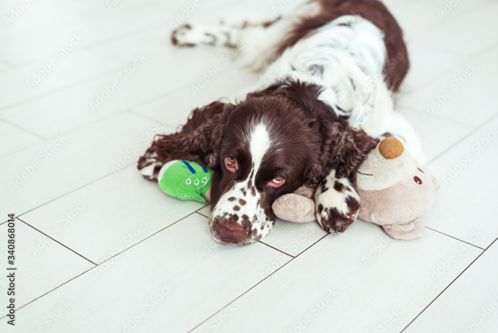 English Springer Spaniel is lying down on the floor next with your favorite soft toy, teddy bear