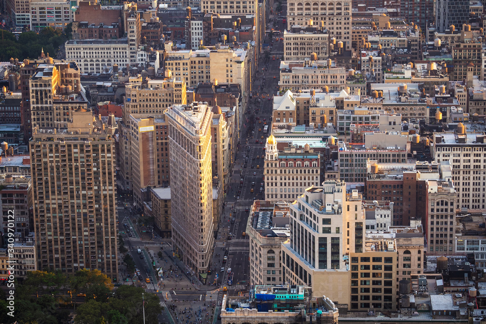 Aerial view of Manhattan including architectural landmark Flatiron Building in New York City, United States of America.