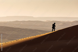 Man walking on dunes of Desert Sahara with beautiful lines and colors at sunrise. Merzouga, Morocco