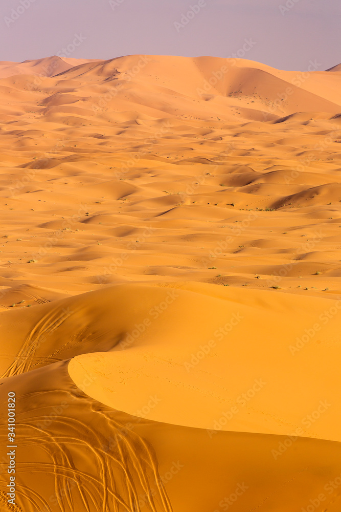 Desert Sahara with beautiful lines and colors at sunrise. Merzouga, Morocco