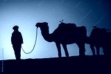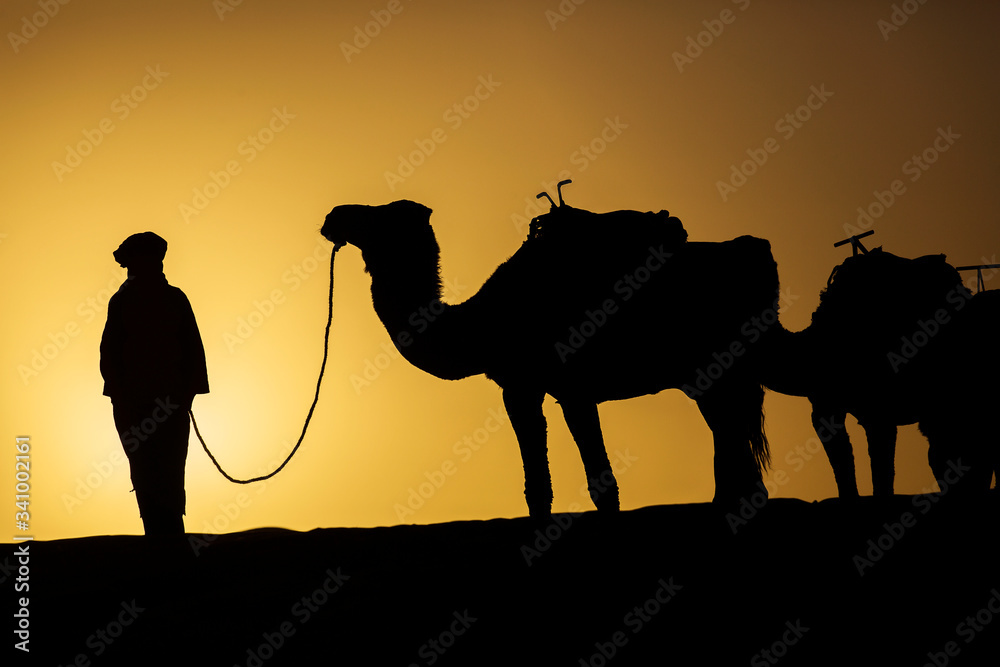 Silhouette of a camel caravan at sunrise in desert Sahara, Morocco