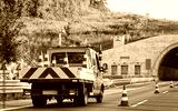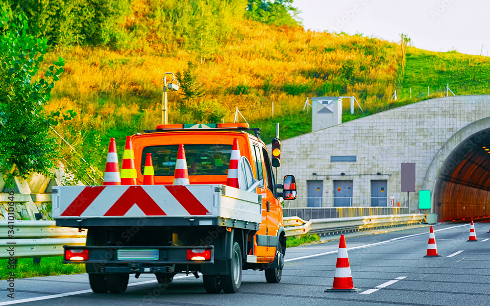 Truck carrying road safety cones on asphalt road of Slovenia reflex